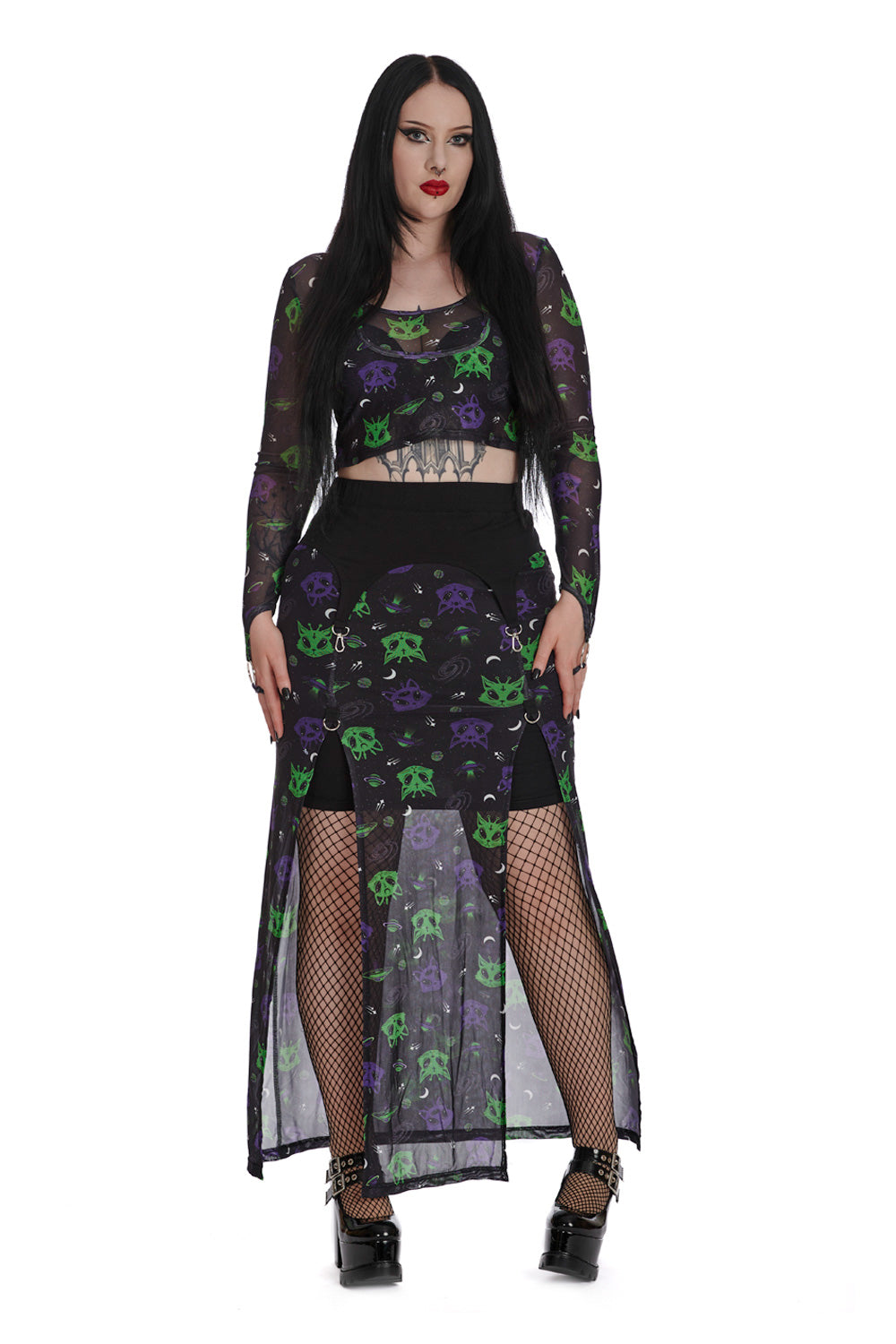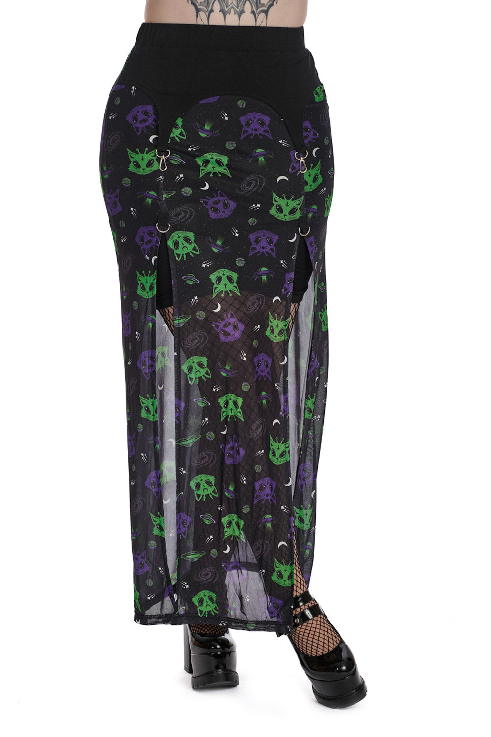 Banned Alternative ALIEN SPACE CAT MESH SLIT SKIRT