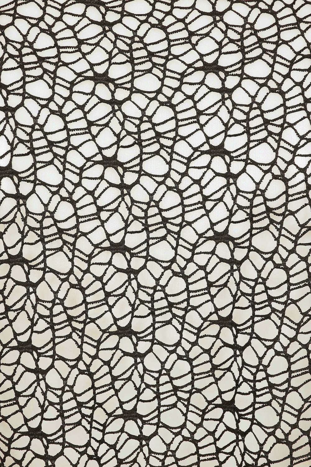 This alternative top is a striking piece crafted from black lace in an intricate, web-like pattern. Its semi-sheer design creates a dramatic and edgy aesthetic, perfect for layering over other garments or wearing as a bold statement on its own. The top features a cropped fit with a slightly scalloped hemline for added detail. The long, flared sleeves enhance its alternative vibe, adding a touch of elegance with their flowing silhouette. Its round neckline ensures a classic shape that contrasts beautifully with the unconventional texture and transparency of the fabric. This top pairs well with high-waisted skirts or trousers and is ideal for gothic, punk, or festival-inspired looks.
