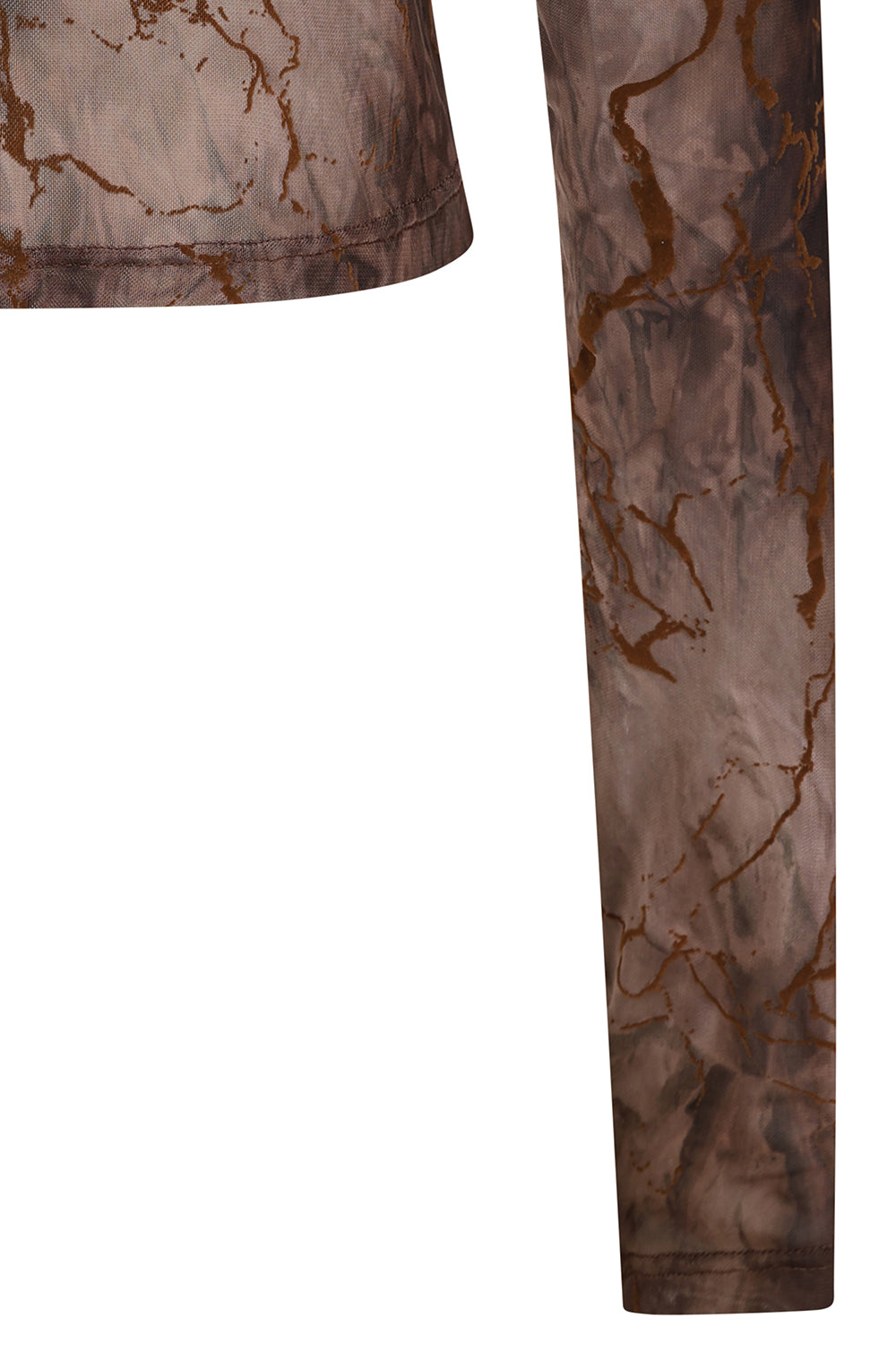This alternative mesh top features intricate flocking detail, adding a textured and dynamic aesthetic to its design. The high neckline and long sleeves offer a sleek and fitted silhouette, while thumb holes add a functional and edgy touch. Its lightweight and breathable fabric make it ideal for layering or wearing on its own, perfect for creating a bold statement.