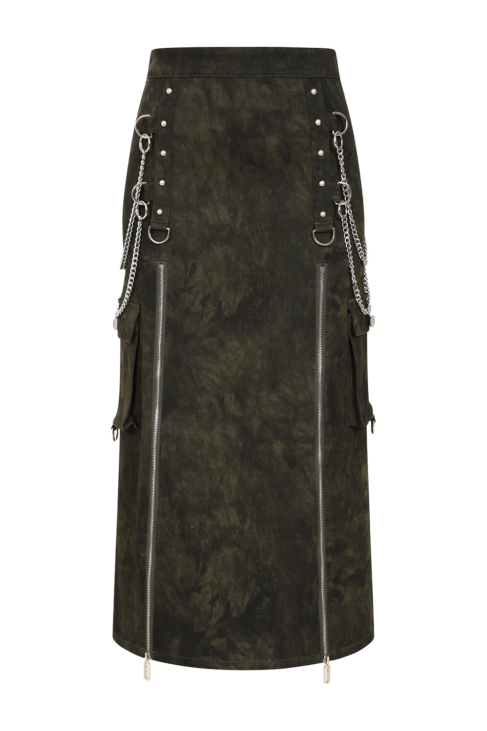 This alternative long skirt features a unique combination of edgy details and distressed fabric. Crafted in an earthy tone with a textured distressed finish, it incorporates two front zips with striking razor-shaped zip pullers, adding a bold statement. The skirt is accented by detachable side chains linked with silver-toned hardware, offering a customizable look. Functional elements include multiple pockets, enhancing its utility. The mid-calf length and structured design make it versatile for alternative and gothic-inspired outfits, balancing practicality with an aesthetic edge.