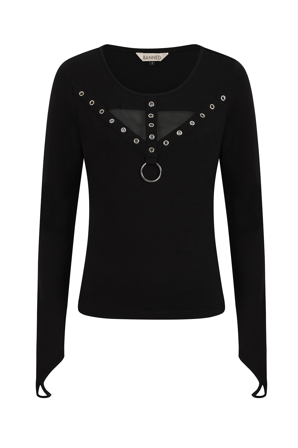 This Banned alternative top showcases a sleek black design with distinctive finger loops at the extended cuffs, adding a dramatic and functional touch. The fitted silhouette is complemented by a V-shaped mesh cutout at the neckline, framed with silver eyelet details for an edgy, industrial-inspired look. A central strap adorned with eyelets and a bold silver O-ring accentuates the top s punk and gothic aesthetic. The long sleeves and minimalist structure make this piece perfect for layering or as a statement item, ideal for alternative fashion enthusiasts.