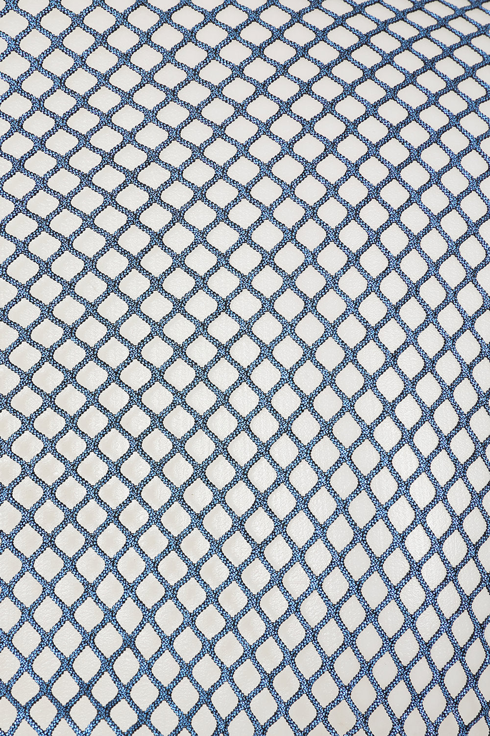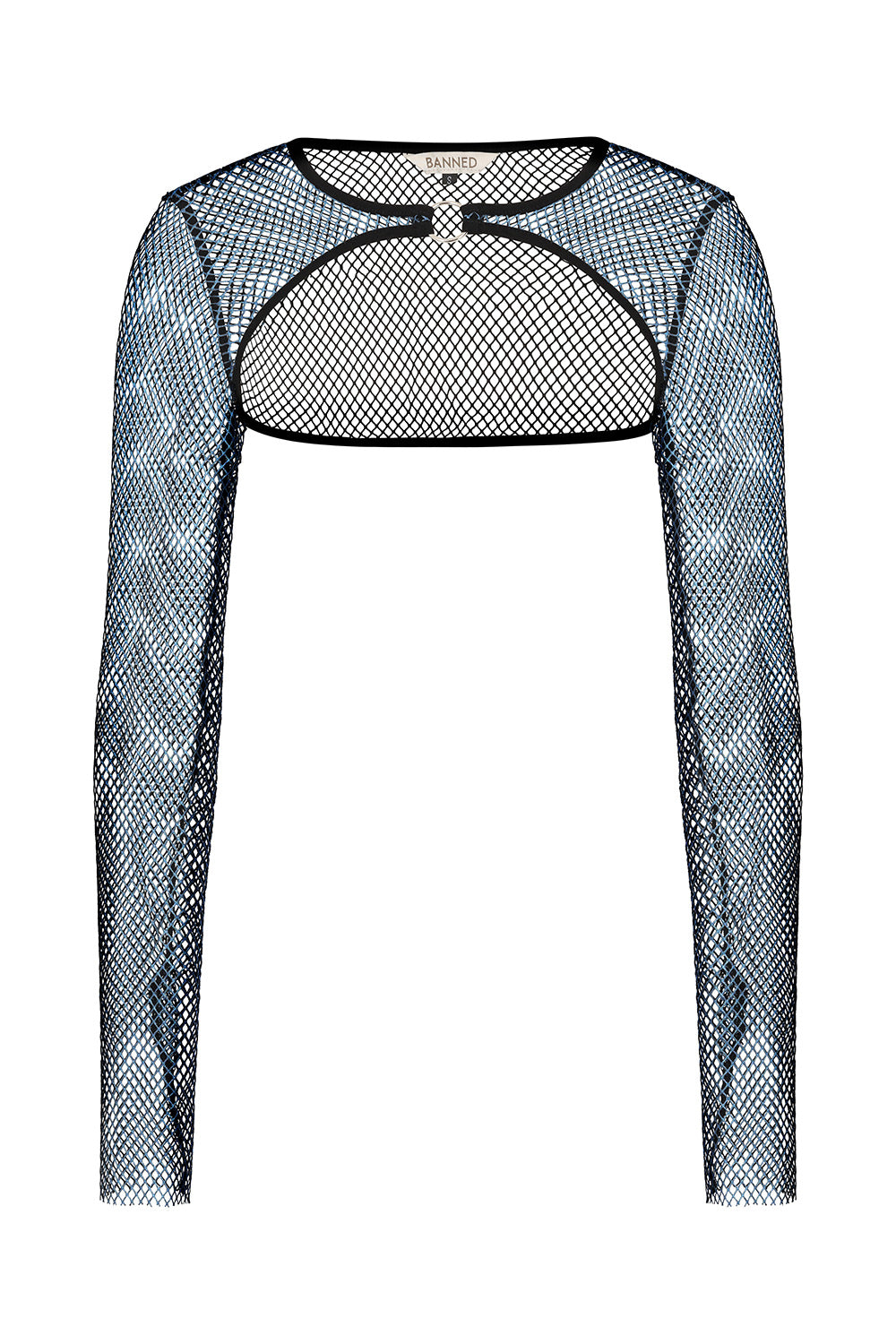 This alternative fishnet top in black with blue metallic features an intricate, open-weave design that is both edgy and versatile. The fabric has a metallic blue effect woven into the black netting, adding a touch of shimmer and sophistication. The top is designed with long sleeves and a cropped length, making it perfect for layering over or under other garments. A rounded neckline with a small clasp detail enhances its structured yet daring aesthetic. This piece combines gothic influences with a contemporary twist, making it an ideal addition to an alternative wardrobe.