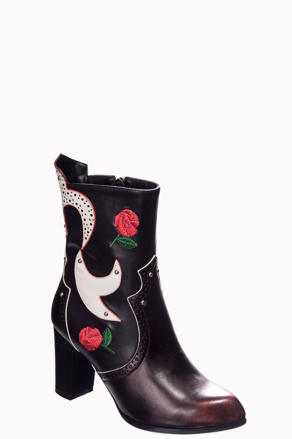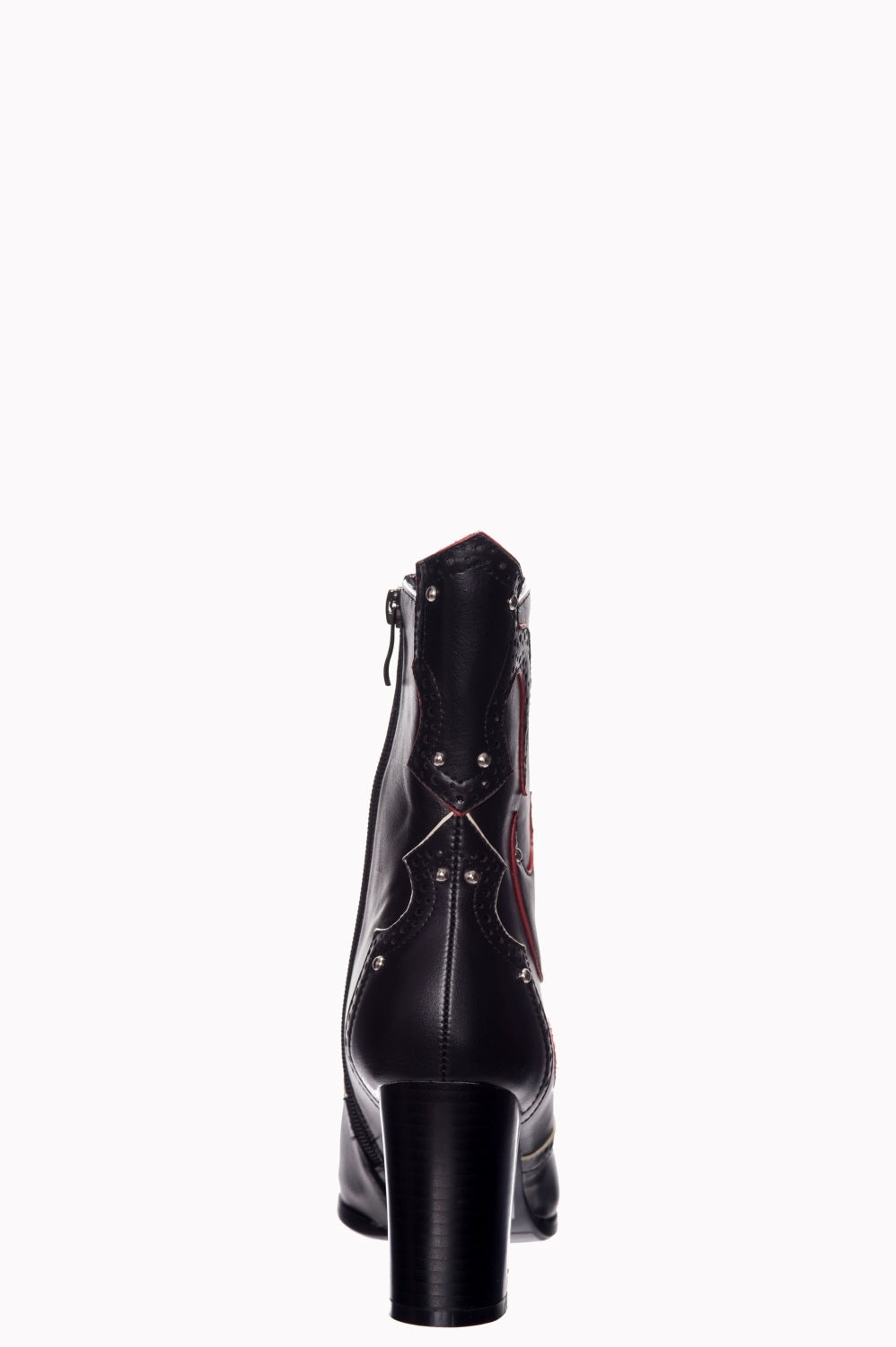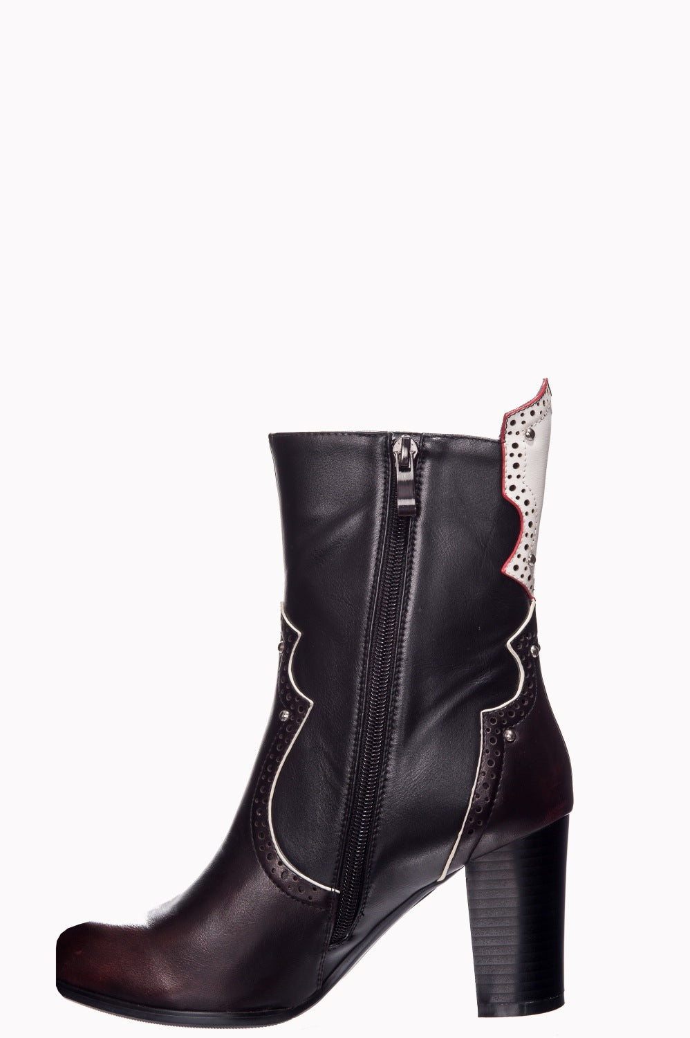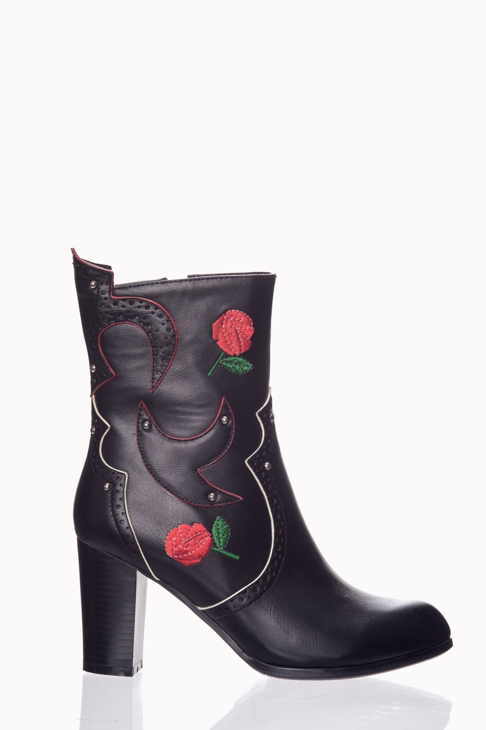 TALL ANKLE BOOT WITH WESTERN EMBROIDERY DETAILS UPPER: WAXED PU MATERIAL WITH PU APPLICATIONS WARM LINING INSOLE: VEGAN LEATHER OUTSOLE: TPR HEEL HEIGHT 8 CM NORMAL FIT