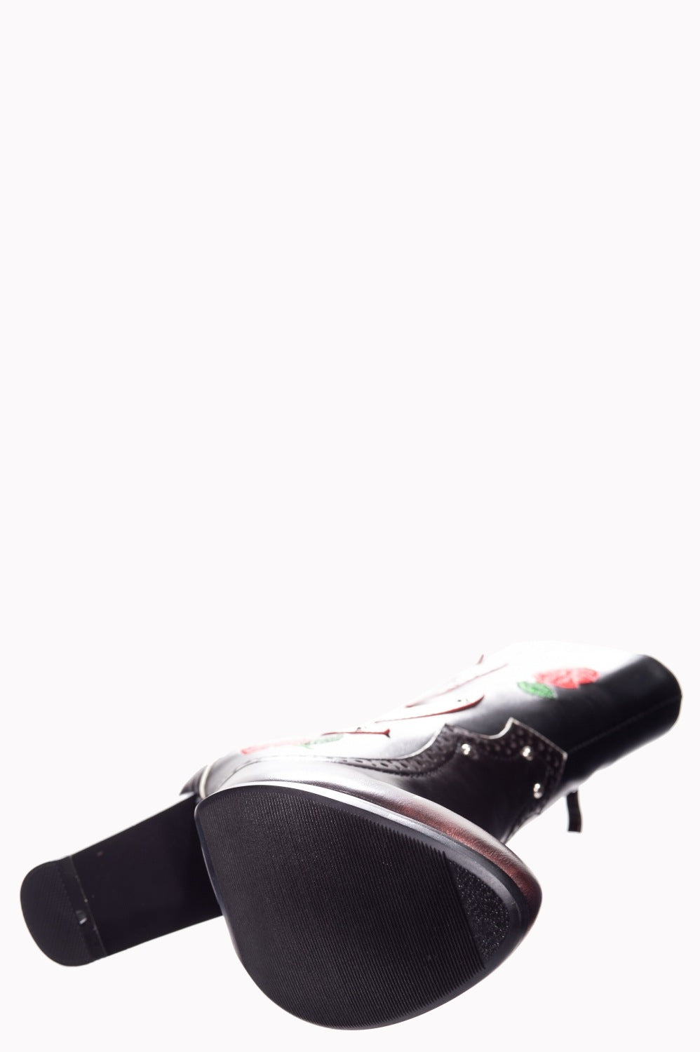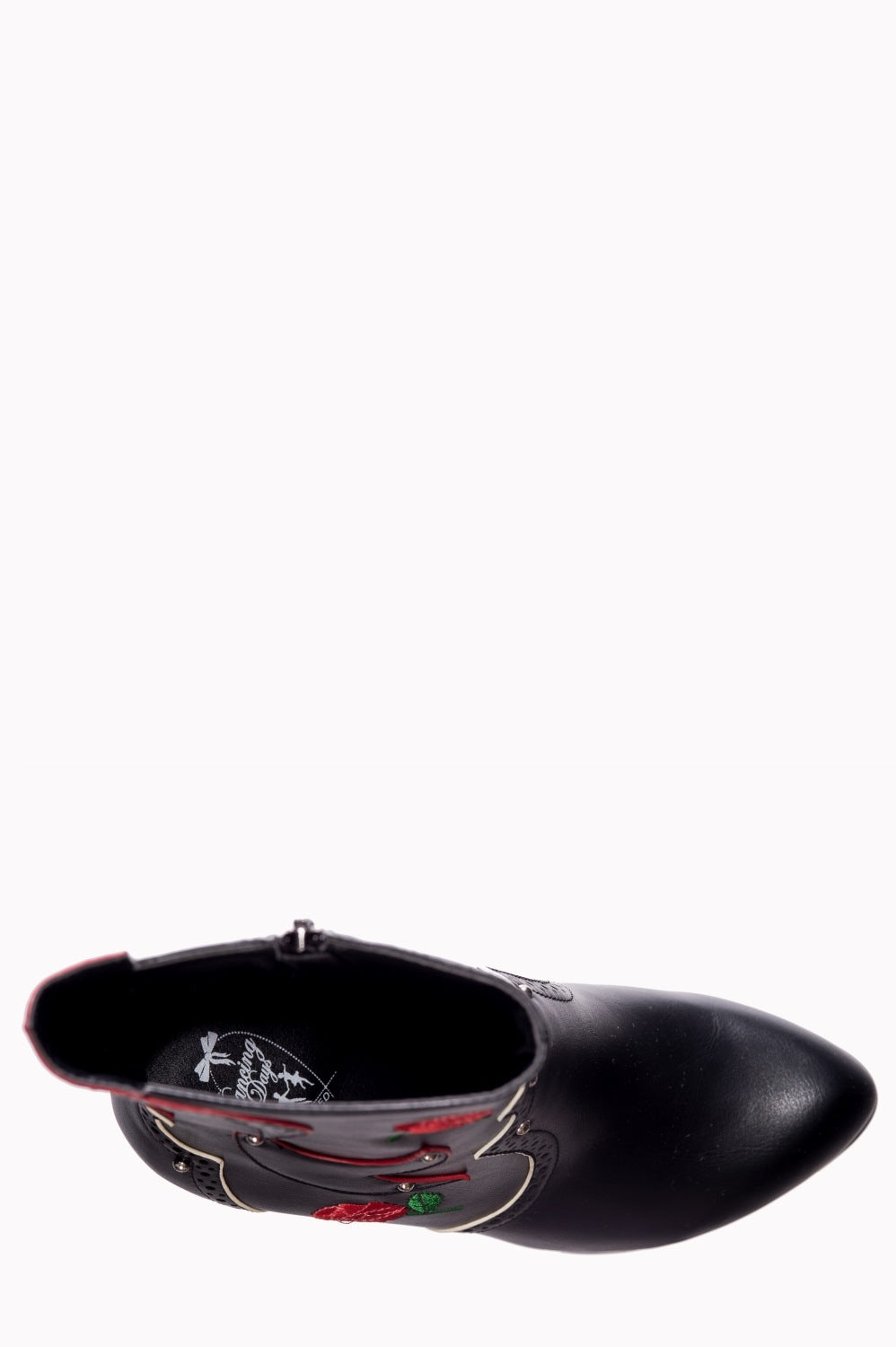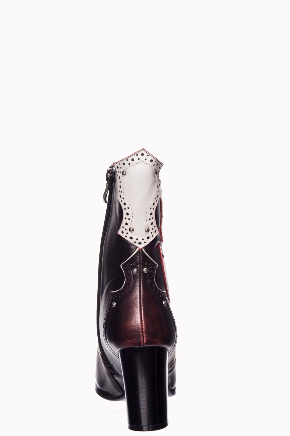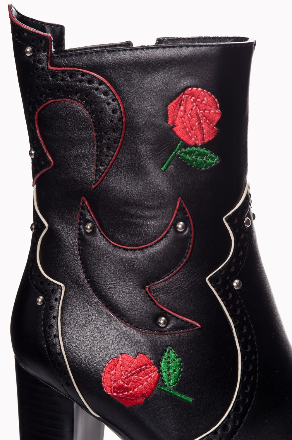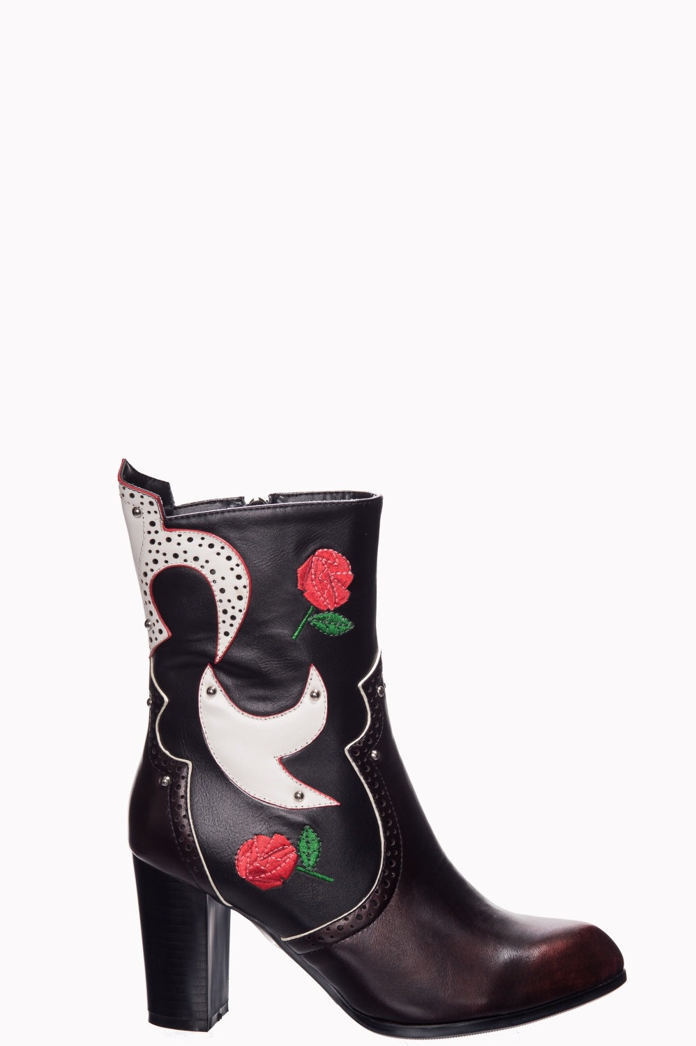 TALL ANKLE BOOT WITH WESTERN EMBROIDERY DETAILS UPPER: WAXED PU MATERIAL WITH PU APPLICATIONS WARM LINING INSOLE: VEGAN LEATHER OUTSOLE: TPR HEEL HEIGHT 8 CM NORMAL FIT